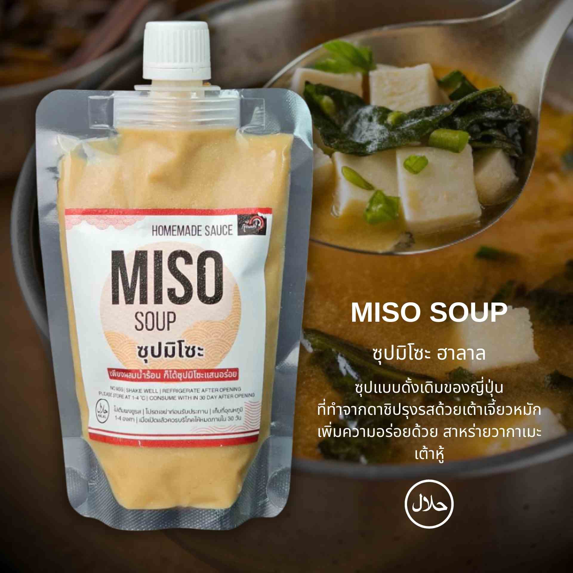 Miso Soup ซุปมิโซะ 200 ml มิโซะ เป็นเครื่องปรุงสุดพิเศษสำหรับอาหารญี่ปุ่น ทำจากถั่วเหลืองหมักกับข้าวและเกลือ รสเค็ม หอม ซุปมิโซะสูตรนี้ปรุงมาให้แบบพร้อมทาน รวมวัตถุดิบทุกอย่างไว้ในขวดเดียว สามารถเทใส่น้ำร้อน พร้อมเสิร์ฟได้ทันที หรือจะใส่ในน้ำซุปดาชิเพิ่มรสอุมามิ นิยมใส่สาหร่าย เต้าหู้ หรือผักและเนื้ออื่นๆ เป็นเมนูประจำในมื้ออาหารของชาวญี่ปุ่น เพียงผสมน้ำร้อน ก็ได้น้ำซุปมิโซะแสนอร่อย