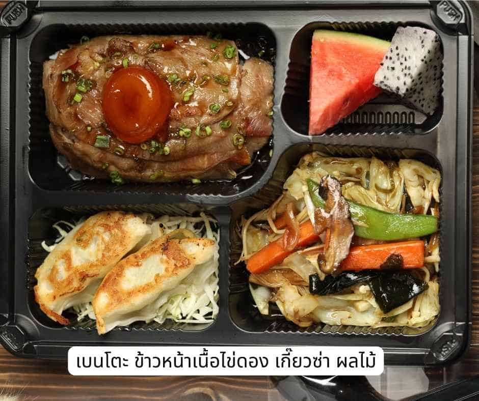 เบนโตะ ข้าวหน้าเนื้อไข่ดอง อาหารกล่อง ฮาลาล เกี๊ยวซ่า ผลไม้