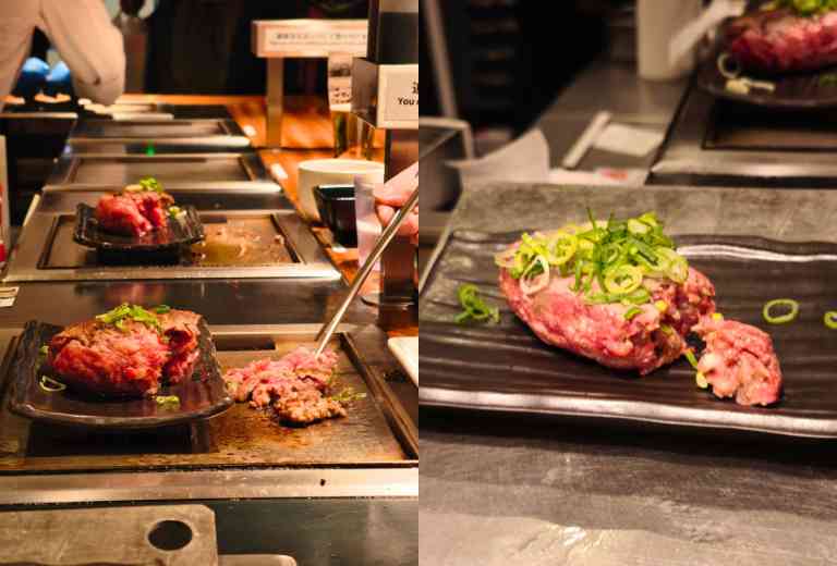 พระเอกของร้านก็คือ แฮมเบิร์กวากิวฮาลาล Black Wagyu นั่นเอง ทางร้านจะเสิร์ฟเนื้อวากิวปั้นก้อนมาให้เรา พนักงานจะย่างด้านนอกนิดหน่อยให้พอมีกลิ่นหอม โรยต้นหอม วางบนเตาเทปัน ให้เราได้ย่างเองตามใจชอบ เลือกระดับความสุกได้ตามความชอบเลย จะทานสุกมาก สุกน้อย เกรียมๆ หน่อย ก็แล้วแต่ความชอบเลย