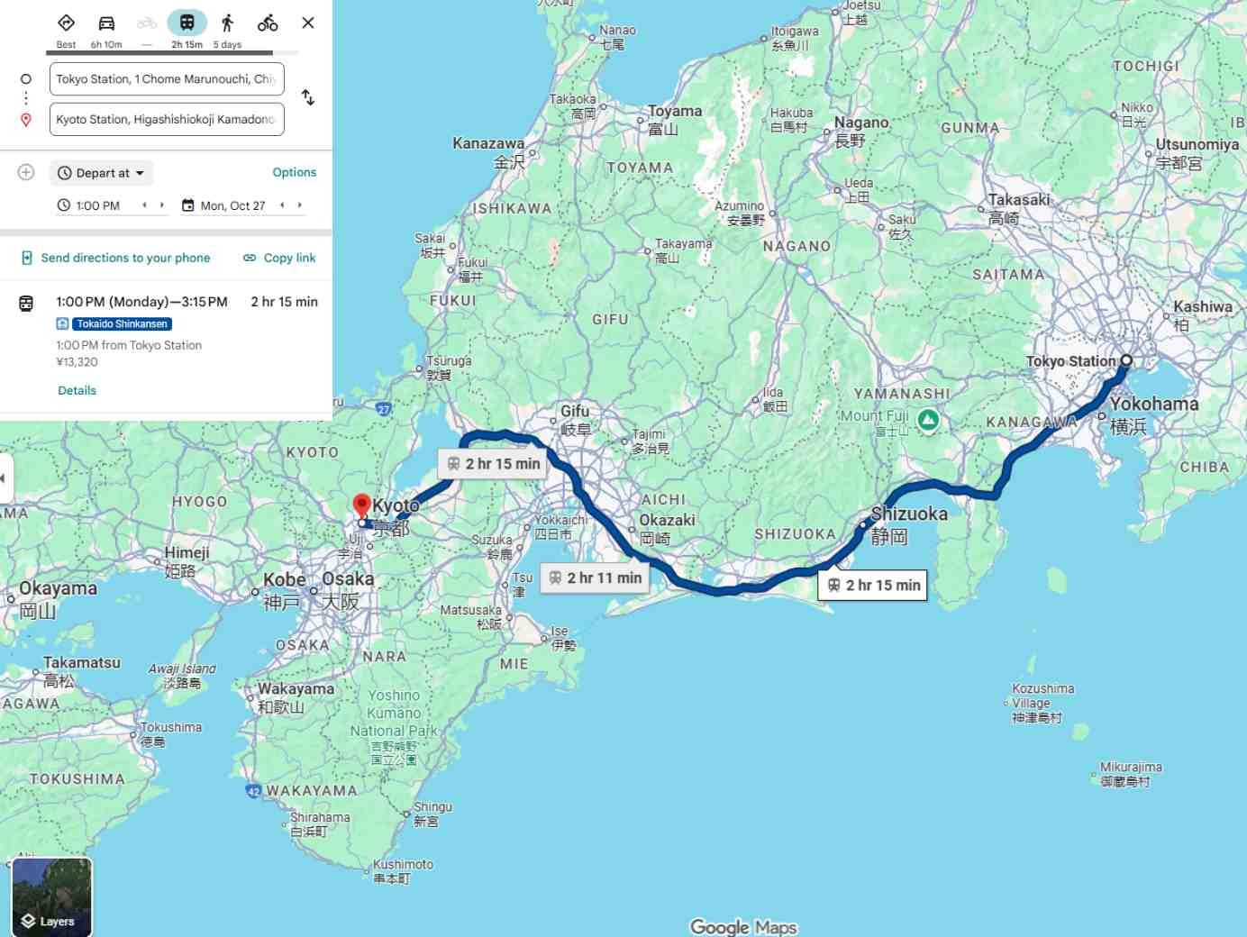 ภาพแสดงราคาตั๋วรถไฟชินคันเซ็นจากโตเกียวไปเกียวโต เพื่อใช้คำนวณว่า JR Pass คุ้มไหม