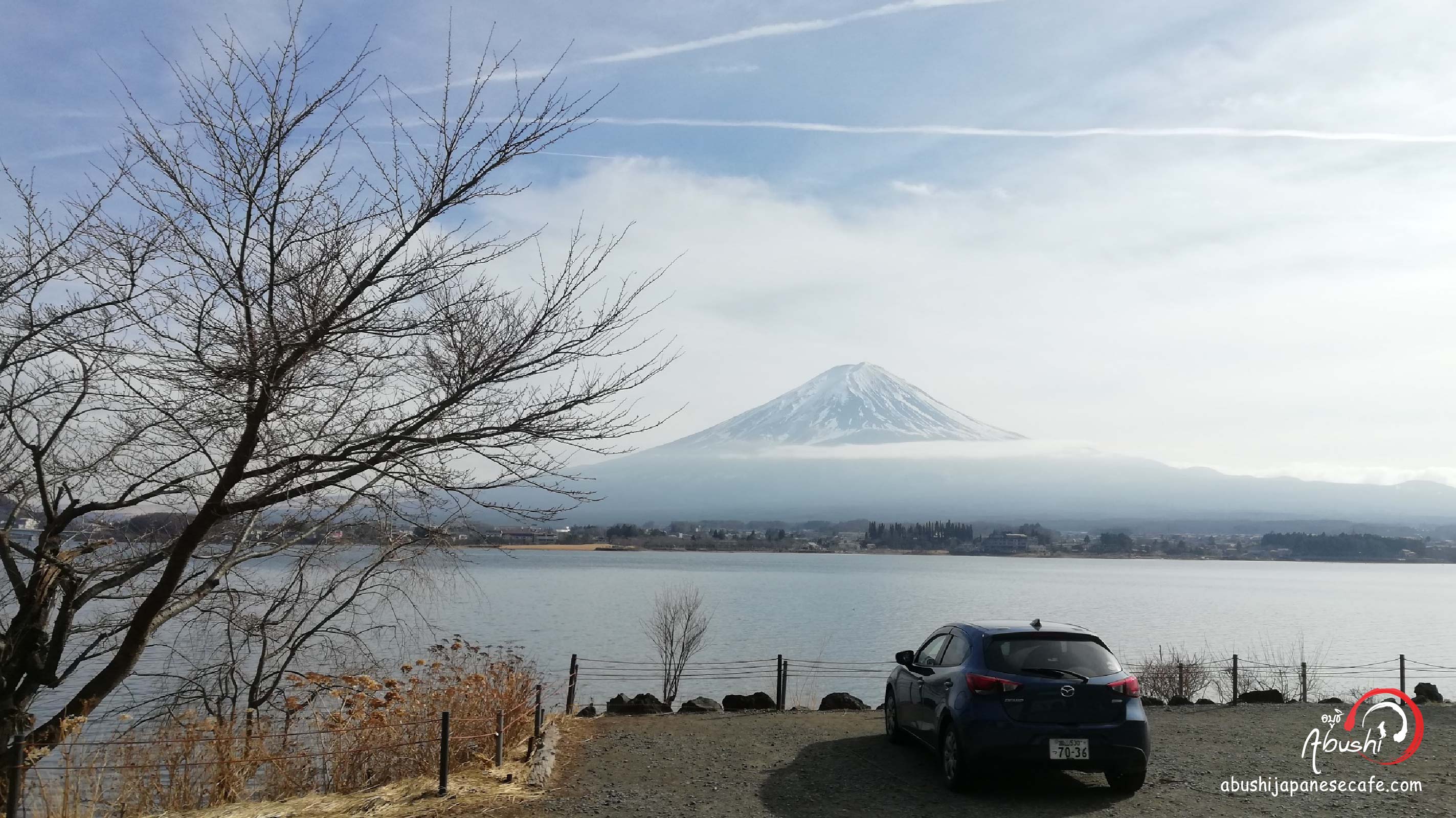 เราเลือกที่จะเดินทางไปสถานีสุดท้ายก่อน สุดเส้นทางจะมีคาเฟ่ ตรงนั้นเป็นมุมถ่ายรูป เห็นวิวทะเลสาปและมีวิวฟูจิอยู่ด้านหลังชัดเจน วันนี้เรามีโอกาสดีมากที่ฟูจิซังไม่ขี้อาย โผล่ออกมาให้เราได้เห็นกันอย่างชัดเจน